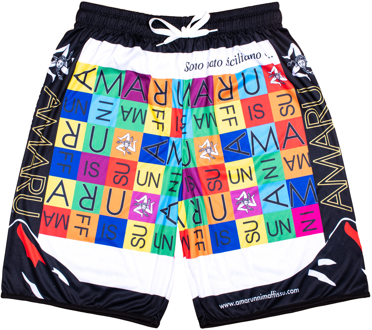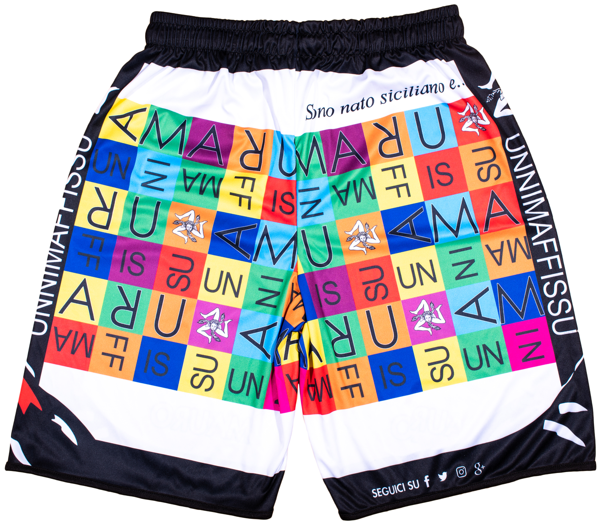 Questo bermuda copricostume presenta una grafica a scacchi multicolore, arricchita dalla scritta "Sono nato siciliano e..." e il logo Unnimaffissu su entrambi i lati. La grafica viene trasferita sul tessuto tramite il processo di sublimazione, che la rende indelebile, priva di consistenza al tatto e con colori brillanti e unici.